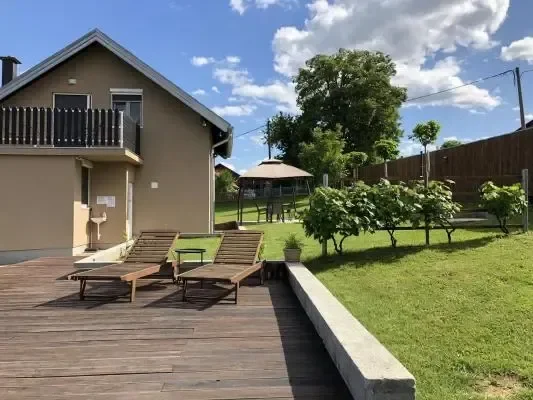 The house is located near the Žumberak-Samoborsko gorje Nature Park, the Japetić excursion site, Svetojanske toplice and just a few minutes drive from the picturesque town of Jastrebarsko. Inside the house, you will find a luxuriously decorated space with an old-world charm, a modernly equipped kitchen and a spacious living room, a bedroom, a bathroom, an attic decorated as an open space with beds and a tavern for socializing. One of the most impressive features of this house is a private pool that allows you to relax and refresh in your own little corner of paradise (open seasonally) and a jacuzzi open all year round. A gazebo with a barbecue and a table for enjoying your meal and the view, and a children's playground. For cycling enthusiasts, we have two bicycles at your disposal for riding along the attractive cycling path that takes you through the natural charms of the surroundings. Whether you are looking for moments of escape from everyday stress or want to explore natural beauty and local culture, this luxury house offers the perfect combination of comfort, nature, swimming pool and cycling path.