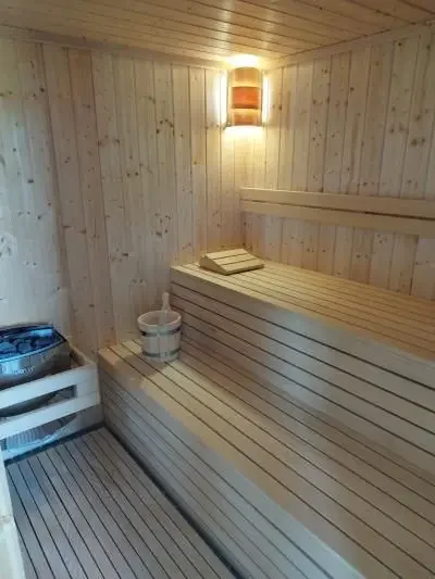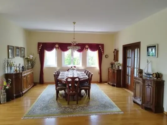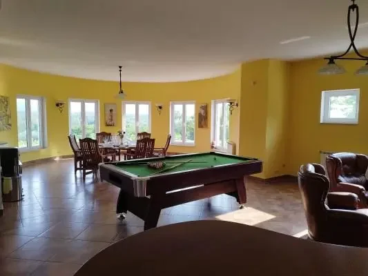 The vacation house consists of two dining rooms, two living rooms, six bedrooms, five of which are double, one is a single room and five bathrooms. Living room has sofas and a bar. The leisure offer includes a pool table, table football, a Conrad Krause Berlin piano, a Finnish sauna for four people and a hydromassage tub (jacuzzi) for six people. The facility is air-conditioned and there is a barbecue equipment in the yard.